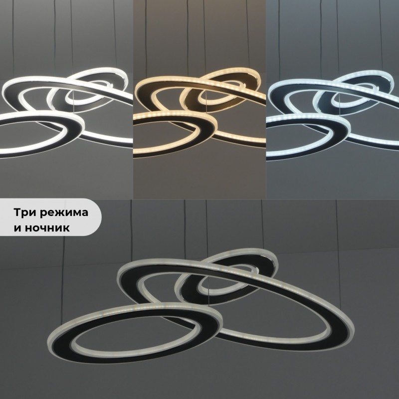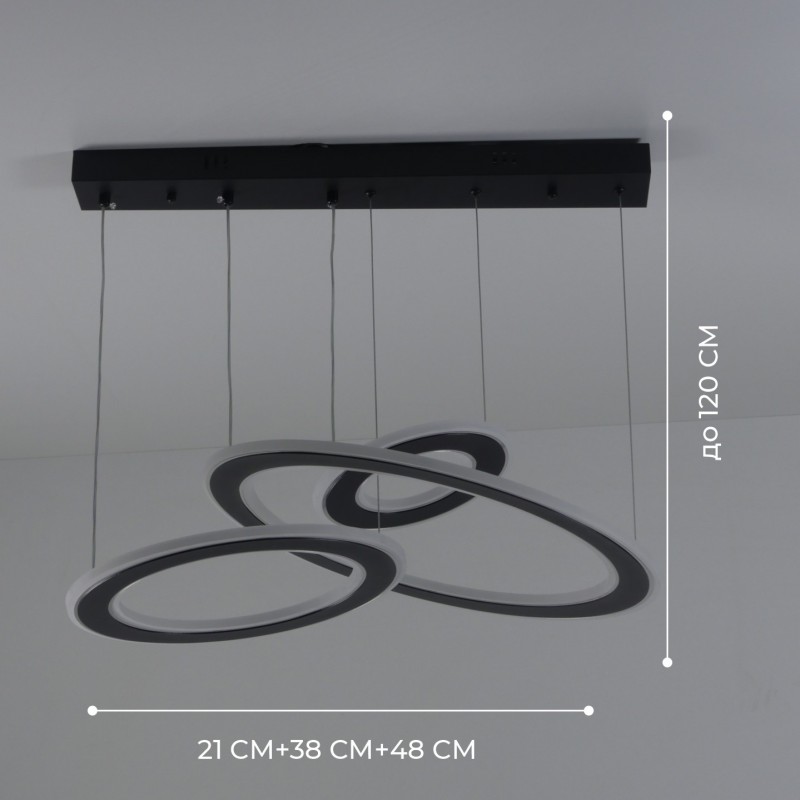 С помощью пульта дистанционного управления можно регулировать цветовую температуру и яркость. Данный светильник подходит для всех типов потолков включая натяжной. Светильник удерживает тонкий провод с возможностью регулировки высоты установки светильника (это позволяет применять светильник в комнатах с невысокими потолками или наоборот, регулируя тросы - устанавливать светильник на максимальном расстоянии от потолка, например над обеденным столом, барной стойкой или рабочей зоной).