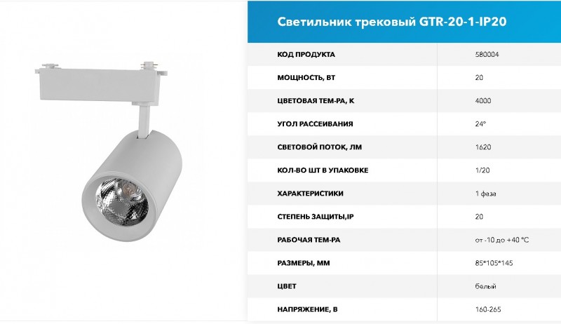 Купить Светильник трековый 20 Вт 1 фаза GTR-20-1-IP20 белый (1/20) в Ульяновске